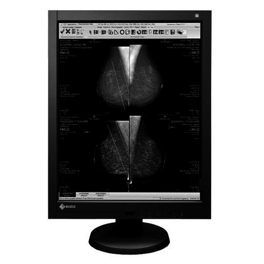 “Information volume” of a digital mammography image should exceed 5 million pixels. When a lower resolution monitor displays this “Information volume”, the monitor stretches the information forcing the mosaic to appear as shadings. With a 2048 x 2560 resolution or 5.24 million pixels, the stretching effect is minimized and the mosaic becomes suitable for rendering subtle masses and calcifications, within the mammography image.